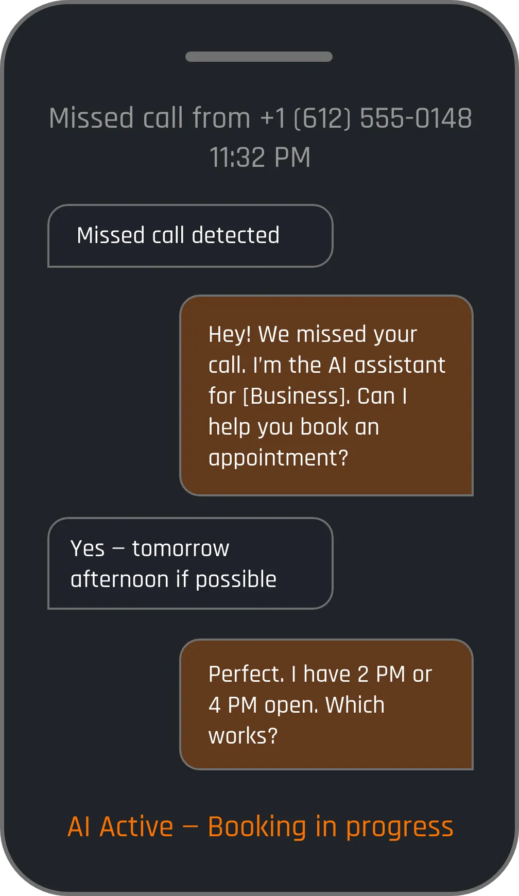 AI Voice & SMS auto-attendants that turn every missed call into a booked appointment — 24 hours a day, without a single human in the loop.