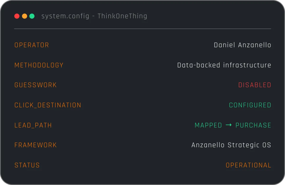 ThinkOneThing is the engine room for Daniel Anzanello’s strategic frameworks. While other agencies guess, we use data-backed infrastructure to ensure every click has a place to land and every lead has a path to purchase.
